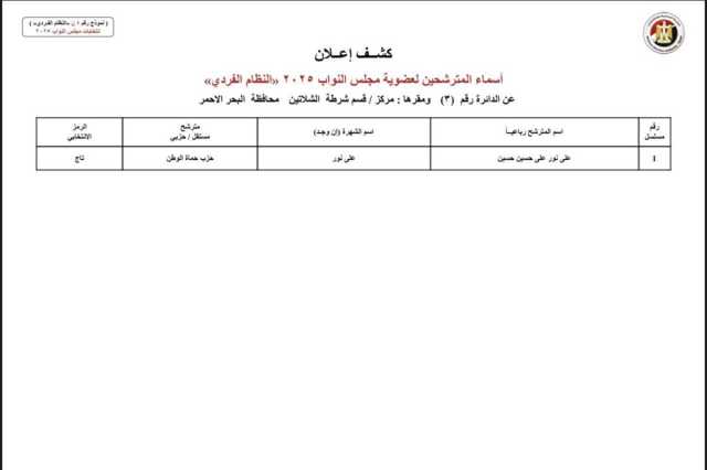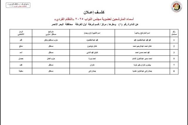 أسماء القائمة المبدئية للمرشحين الفرديين لانتخابات النواب في دوائر البحر الأحمر