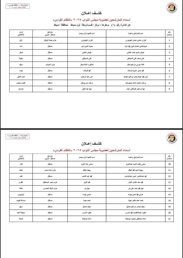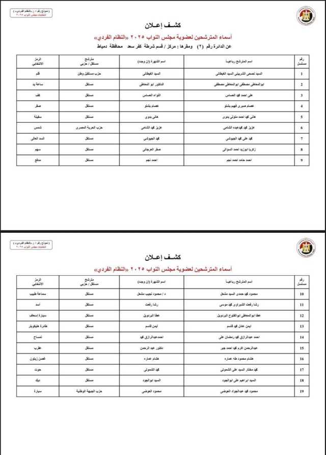 الوطنية للانتخابات تعلن أسماء القائمة المبدئية لمرشحي النواب الفرديين في دمياط