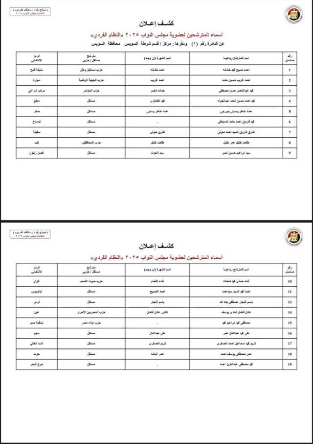 القائمة المبدئية للمرشحين بنظام الفردي في انتخابات النواب بمحافظة السويس