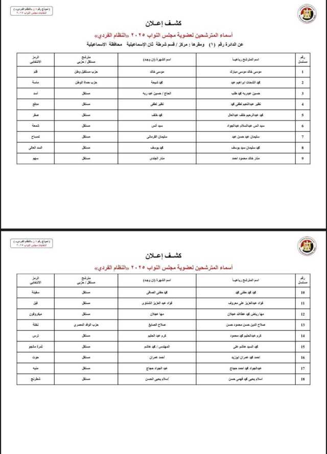 الوطنية للانتخابت تنشر القائمة المبدئية للمرشحين الفرديين في انتخابات النواب بالإسماعيلية