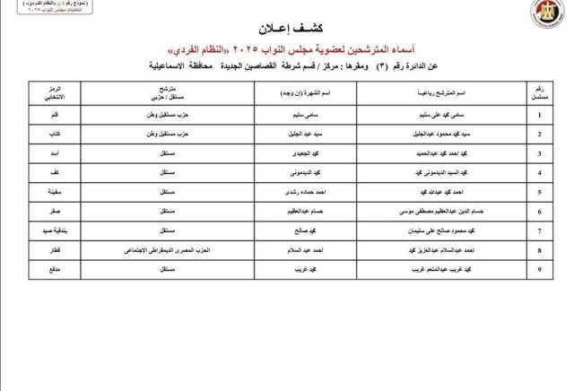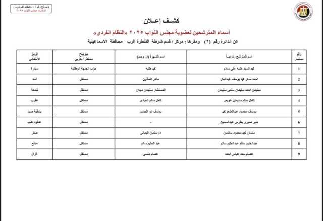 كشفت الهيئة الوطنية للانتخابات النقاب عن القائمة المبدئية للمرشحين المتقدمين لخوض انتخابات مجلس النواب على المقاعد الفردية بمحافظة الإسماعيلية.