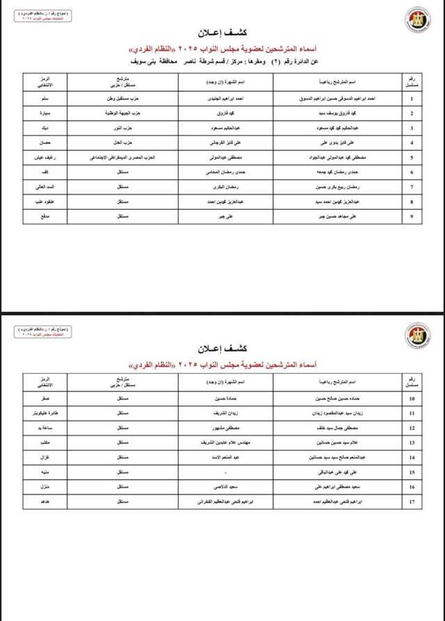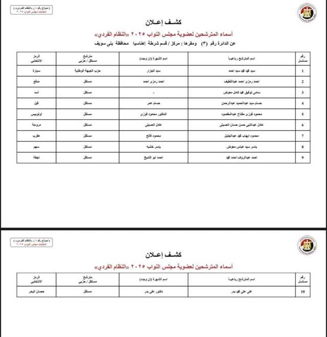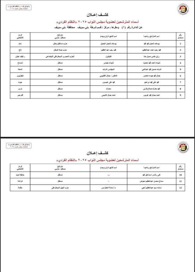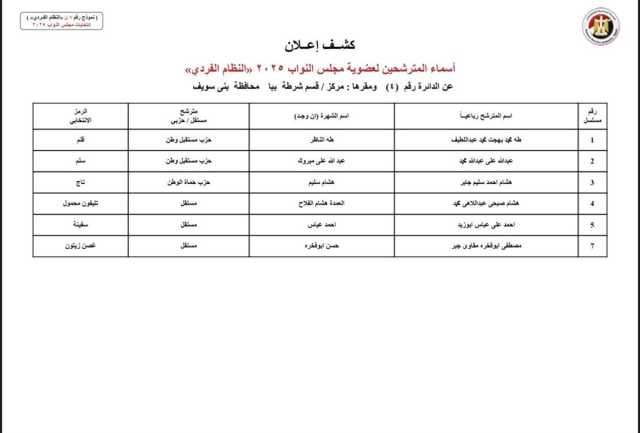 ننشر القائمة المبدئية لمرشحي الفردي في انتخابات النواب ببني سويف