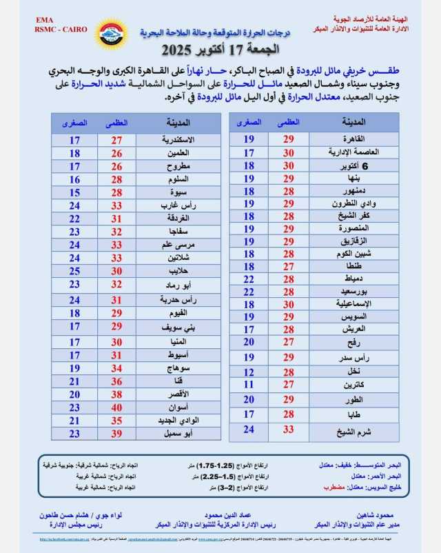 درجات الحرارة اليوم 17-10-2025درجة الحرارة في القاهرة .