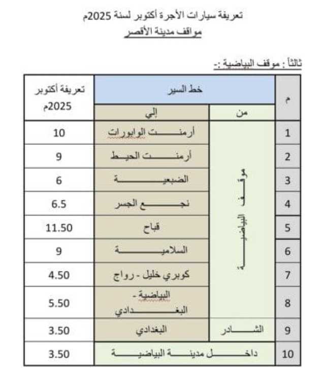كما وجهت اللجنة بسرعة شراء وطباعة الملصقات الخاصة بالتعريفة الجديدة، ليتم وضعها على السيارات وإعلانها للمواطنين بشكل واضح في جميع المواقف لضمان الالتزام بالأسعار المحددة.