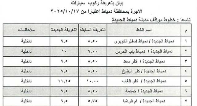 اعتمد الدكتور أيمن الشهابى محافظ دمياط، تعديل تعريفة الركوب لسيارات الأجرة بنطاق المحافظة، وفقًا لما هو موضح بالجداول المرفقة ، كما إعتمد تعديل تعريفة الركوب لسيارات التاكسي وذلك بفتح العداد الكيلو الأول من ١١.٥ جنيه إلى ١٣ جنيه والكيلو الذى يليه من ٣.٤٥ جنيه إلى ٣.٧٥ جنيه ، وذلك عقب قرار لجنة التسعير التلقائي بتحريك أسعار المواد البترولية اعتبارًا من اليوم ..