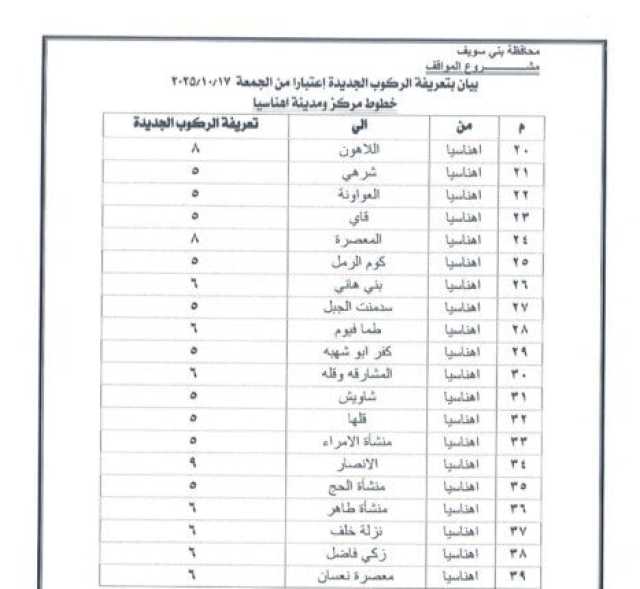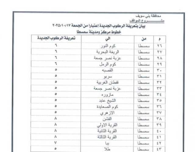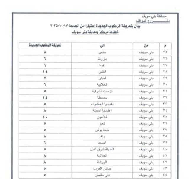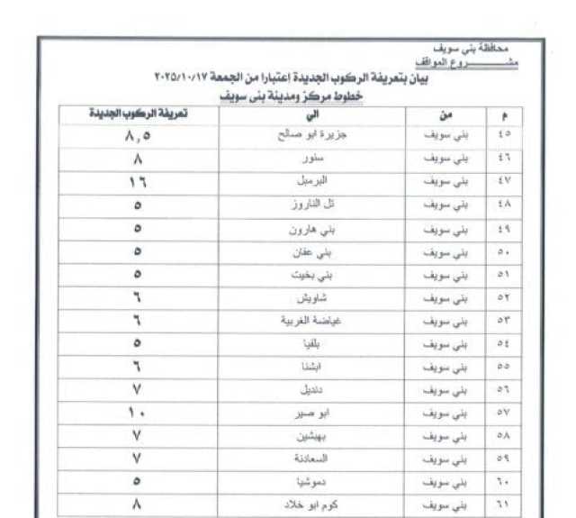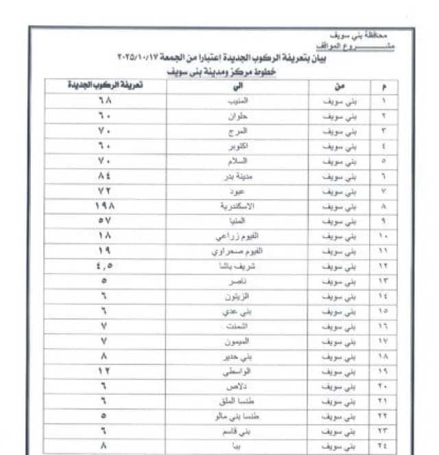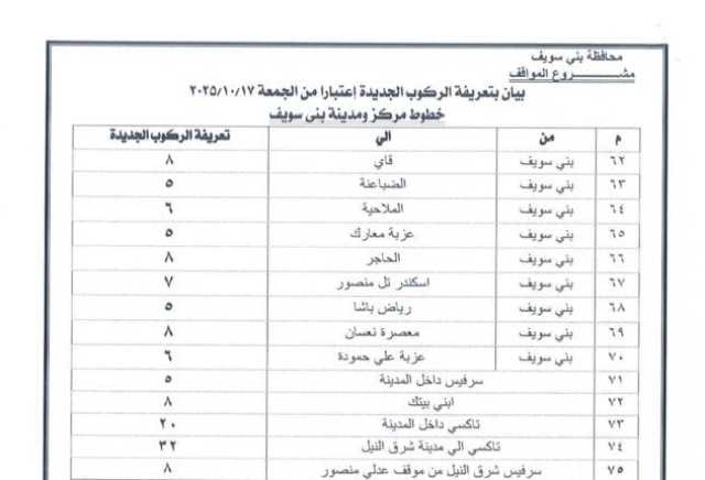 اعتمد الدكتور محمد هاني غنيم محافظ بني سويف التعريفة الجديدة للمواصلات الداخلية والخارجية لسيارات الأجرة والسرفيس والتاكسي داخل المحافظة وبين مراكزها الإدارية، وكذلك بين بني سويف والمحافظات الأخرى، وذلك عقب قرار الحكومة بتحريك أسعار المنتجات البترولية اعتبارًا من السادسة من صباح اليوم الجمعة 17 أكتوبر 2025، وما تضمنه القرار من تثبيت الأسعار داخل السوق المحلي لمدة عام كامل كحد أدنى.