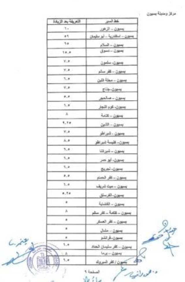 ووجه محافظ الفيوم، مدير عام المواقف، بالإعلان عن التعريفة الجديدة في مكان واضح بجميع مواقف السيارات بدائرة المحافظة، من خلال وضع لافتة مبين بها خطوط السير وقيمة الأجرة المقررة لكل خط، وكذا وضع استيكرات موضح به تعريفة الركوب وخط السير وعدد الركاب يتم لصقها على الزجاج الأمامي والخلفي لسيارات الأجرة والسرفيس، لتعريف المواطنين بتعريفة الركوب الرسمية، وتطبيق القانون بكل حزم على المخالفين.