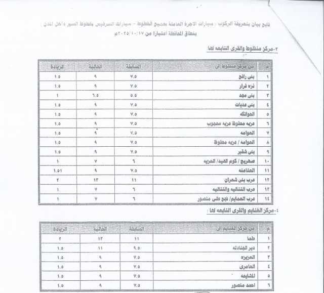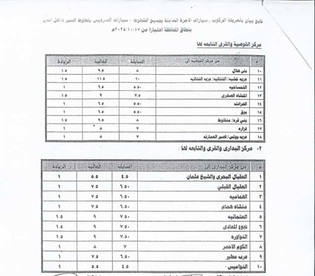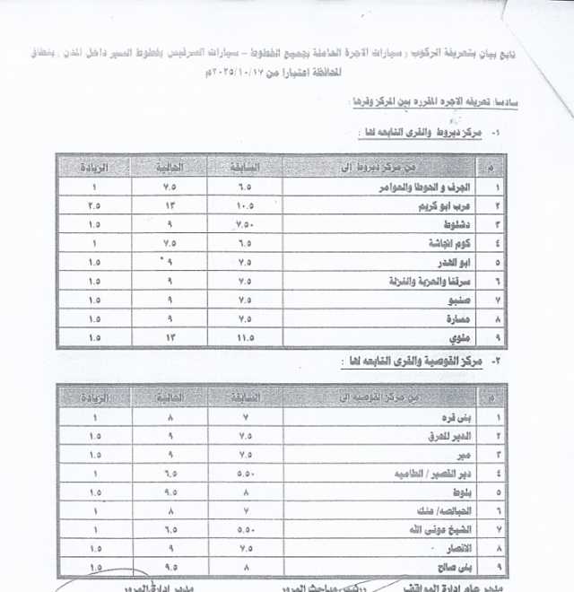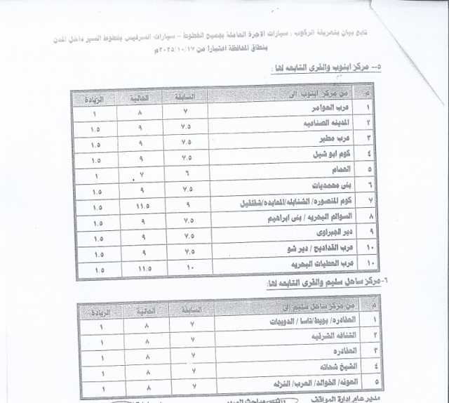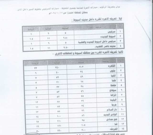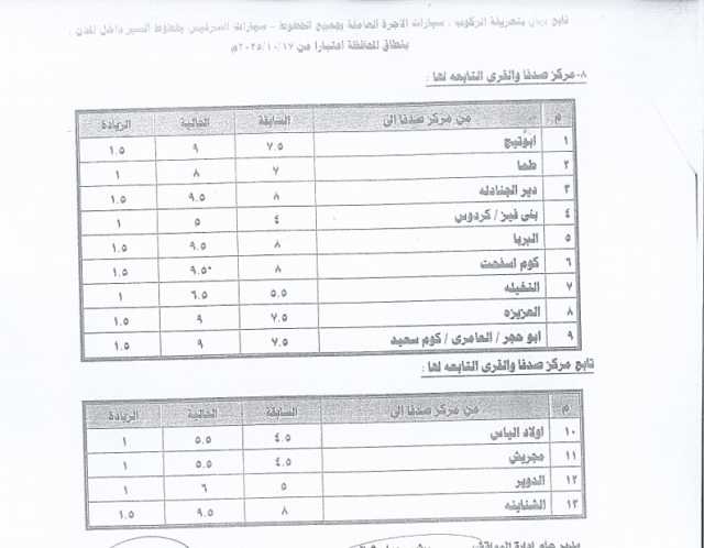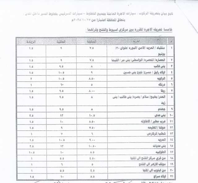 كما شمل القرار تعديل تعريفة الأجرة بين أسيوط والمحافظات الأخرى، حيث بلغت 240 جنيهًا إلى القاهرة، و56 للمنيا، و53 لسوهاج، و121 لقنا، و230 جنيهًا للغردقة، إلى جانب باقي الأسعار التي تم تحديدها وفق المسافات المعتمدة رسميًا.
