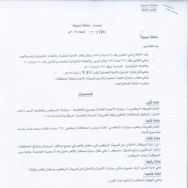 ضبط منظومة النقل بالمحافظة ومنع أي استغلال للمواطنينوأكد محافظ أسيوط أن القرار يهدف إلى ضبط منظومة النقل بالمحافظة ومنع أي استغلال للمواطنين، مشددًا على كافة الأجهزة التنفيذية والرقابية بتكثيف الحملات المفاجئة على مواقف السيارات ومحطات الوقود والأسواق، للتأكد من الالتزام بالتعريفة الرسمية ومنع التلاعب أو رفع الأسعار دون وجه حق.