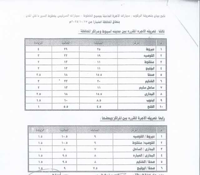 وتضمنت التعريفة الجديدة داخل مدينة أسيوط تحديد أجرة التاكسي بـ17.5 جنيهًا، والسرفيس داخل المدينة بـ6 جنيهات، بينما بلغت 11 جنيهًا لكل من مدينتي أسيوط الجديدة وناصر الجديدة، و6 جنيهات داخل كل مدينة منهما. أما الأجرة بين مدينة أسيوط ومراكزها فجاءت كالتالي: 29 جنيهًا لديروط، 22 للقوصية، 13 لمنفلوط وأبوتيج، 18 لصدفا، 23 للغنايم، 13 لساحل سليم، 18 للبداري، 10 لأبنوب، و5.5 جنيهًا للفتح.