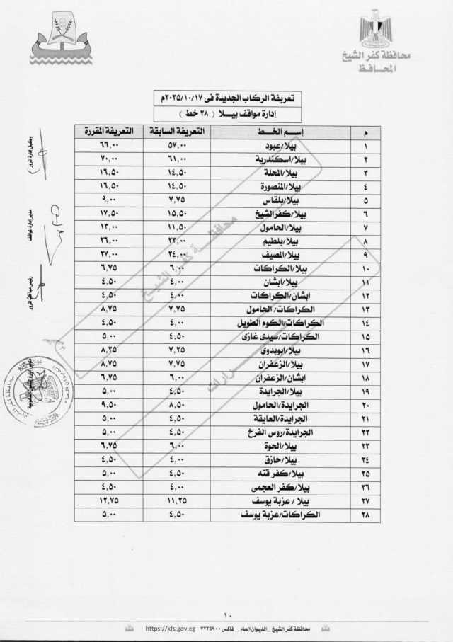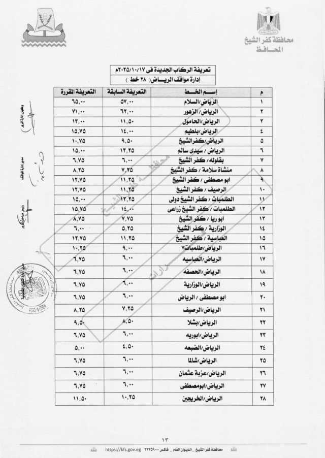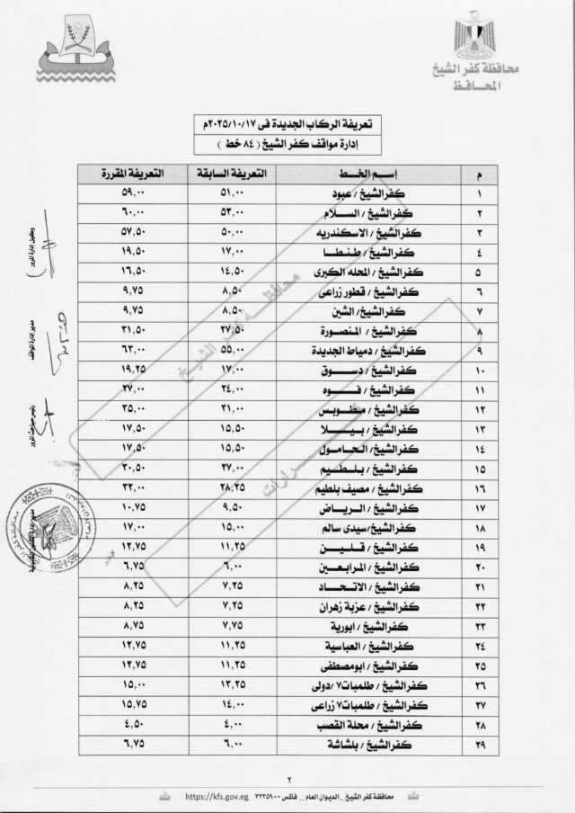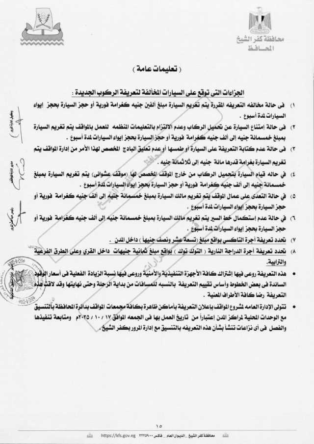 اعتمد اللواء دكتور علاء عبد المعطي، محافظ كفر الشيخ، اليوم الجمعة، التعريفة الجديدة لنقل الركاب على جميع خطوط المواصلات العامة، الداخلية والخارجية، بنطاق المحافظة، وذلك عقب قرار لجنة التسعير التلقائي للمنتجات البترولية بوزارة البترول بتحريك أسعار المنتجات البترولية اعتبارًا من اليوم، محذرًا من استغلال المواطنين أو تحصيل أي مبالغ إضافية تتجاوز التعريفة الرسمية المقررة.