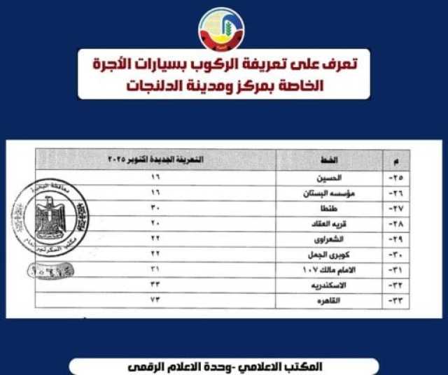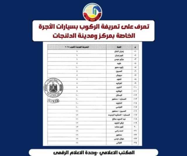 وجاءت التعريفة الجديدة كالتالي: سيارات السرفيس: 6 جنيهات، التاكسي (العداد): فتح العداد 14 جنيهًا، وكل كيلومتر بسعر 1.75 جنيه، التوك توك: 7 جنيهات، تذكرة النقل الداخلي: 6 جنيهات
