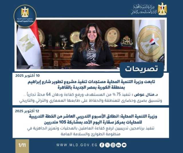 أعلنت الدكتورة منال عوض، وزيرة التنمية المحلية، عن إنطلاق فعاليات الأسبوع التدريبي العاشر بمركز التنمية المحلية بسقارة، والمقرر انعقاده خلال الفترة من 12 حتى 16 أكتوبر 2025، وذلك في إطار تنفيذ الخطة التدريبية للوزارة للعام 2025 / 2026، التي تهدف إلى بناء القدرات ورفع كفاءة الأداء داخل وحدات الإدارة المحلية بمختلف المحافظات.