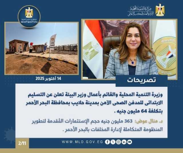 وأعلنت الدكتورة منال عوض وزيرة التنمية المحلية والقائم بأعمال وزير البيئة عن التسليم الإبتدائي للمدفن الصحى الآمن بمدينة حلايب بمحافظة البحر الأحمر من خلال اللجنة المشكلة من وزارات (البيئة، التنمية المحلية ووزارة الدفاع ممثلة في الكلية الفنية العسكرية والهيئة العربية للتصنيع) والأكاديمية العربية للعلوم والنقل البحري ، وهى اللجنة المختصة بتسيير ومتابعة واستلام مشروعات البنية التحتية ضمن برامج تنفيذ المنظومة، بما يضمن تنفيذ بنود كافة الأعمال الواردة بعقود مراحل البنية الأساسية لمنظومة المخلفات بالمحافظات ، وتبلغ التكلفة الإجمالية للمدفن 64.5 مليون جنيه.