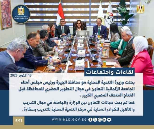 وعقدت الدكتورة منال عوض وزيرة التنمية المحلية والقائم بأعمال وزير البيئة، اجتماعاً مع المهندس عادل النجار محافظ الجيزة، بمقر وزارة التنمية المحلية، وذلك بحضور الدكتورة هند عبدالحليم نائب المحافظ والدكتور أشرف منصور رئيس مجلس أمناء الجامعة الألمانية بالقاهرة، وفريق عمل من الجامعة الألمانية وعدد من قيادات الوزارة، لبحث سبل التعاون بين الوزارة والجامعة الألمانية والمحافظة وبصفة خاصة في مجالات التطوير الحضري قبل افتتاح المتحف المصري الكبير.
