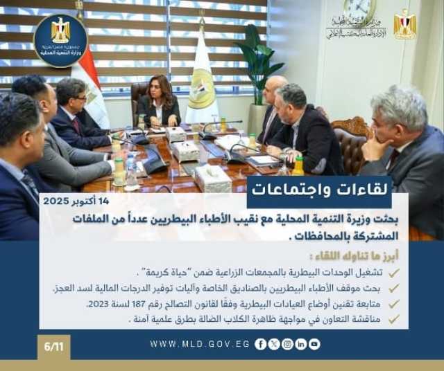 التقت الدكتورة منال عوض وزيرة التنمية المحلية والقائم بأعمال وزير البيئة ، مع الدكتور مجدى حسن، نقيب الأطباء البيطريين لبحث عدد من الملفات الحيوية والخدمية على أرض المحافظات ومجالات التعاون المشترك وعلى رأسها تشغيل الوحدات البيطرية الموجودة في المجمعات الزراعية بقرى المبادرة الرئاسية " حياة كريمة " ومختلف محافظات الجمهورية .