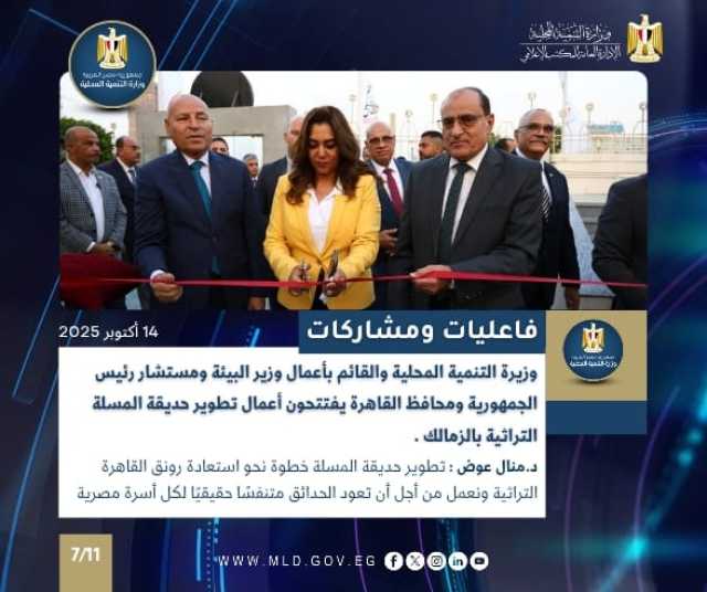 وافتتحت الدكتورة منال عوض، وزيرة التنمية المحلية والقائم بأعمال وزير البيئة، يرافقها اللواء أمير سيد أحمد، مستشار رئيس الجمهورية للتخطيط العمراني، والدكتور إبراهيم صابر محافظ القاهرة، وممثل صندوق "تحيا مصر"، والمهندس محمد أبو سعدة رئيس الجهاز القومي للتنسيق الحضاري، أعمال التطوير الشامل لحديقة المسلة التراثية بمنطقة الزمالك بالقاهرة ، بعد الانتهاء من تنفيذ خطة متكاملة لإحياء الحديقة ورفع كفاءتها بما يتماشى مع قيمتها التاريخية والجمالية .