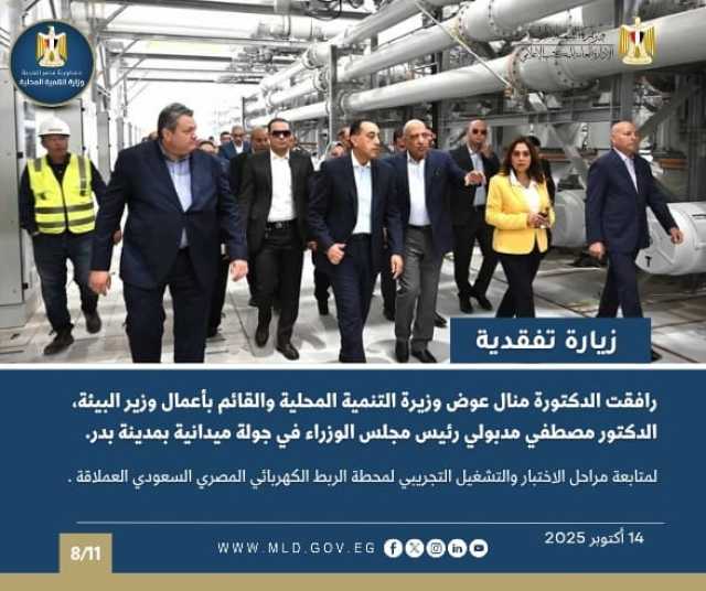 ورافقت الدكتورة منال عوض وزيرة التنمية المحلية والقائم بأعمال وزير البيئة، الدكتور مصطفي مدبولي رئيس مجلس الوزراء في جولة ميدانية بمدينة بدر، لمتابعة مراحل الاختبار والتشغيل التجريبي لمحطة الربط الكهربائي المصري السعودي العملاقة .