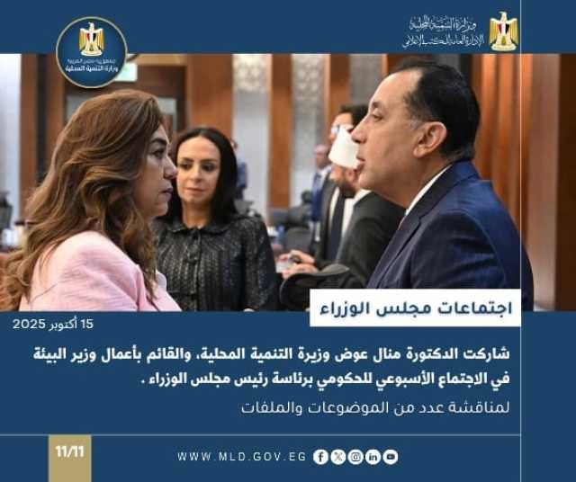شاركت الدكتورة منال عوض وزيرة التنمية المحلية والقائم بأعمال وزير البيئة، في الاجتماع الأسبوعي للحكومة ، بمقرها في العاصمة الإدارية الجديدة؛ وذلك برئاسة الدكتور مصطفى مدبولي، رئيس مجلس الوزراء، لمناقشة عدد من الموضوعات والملفات.