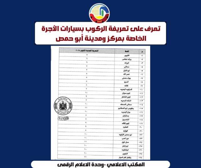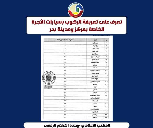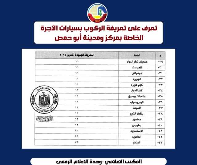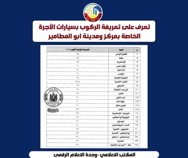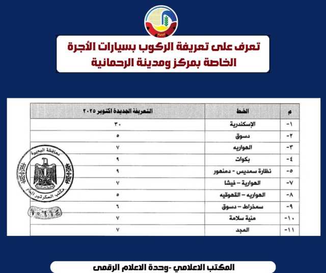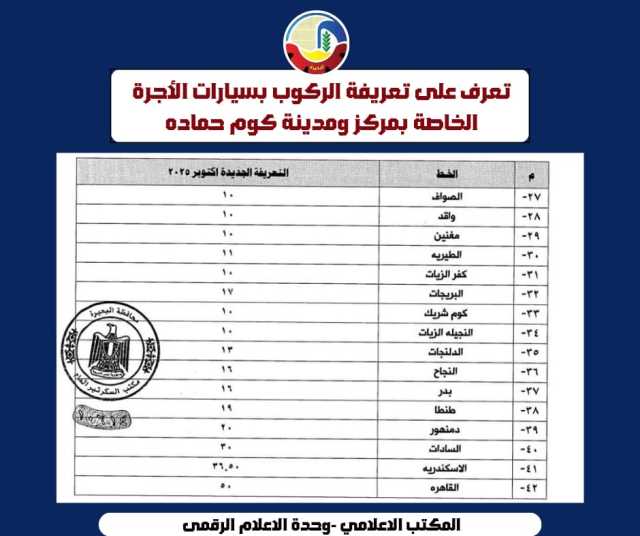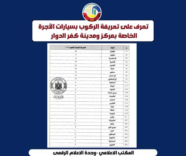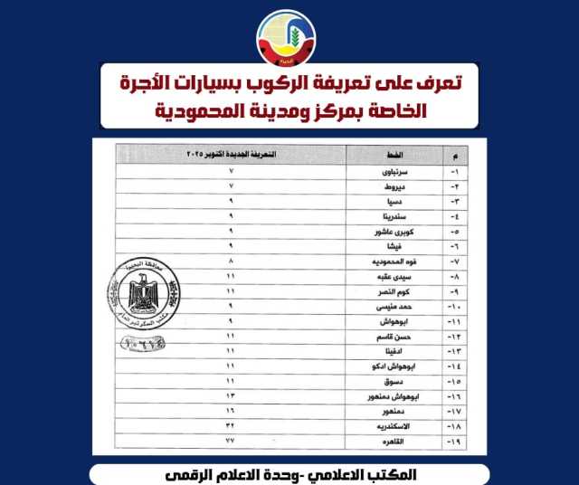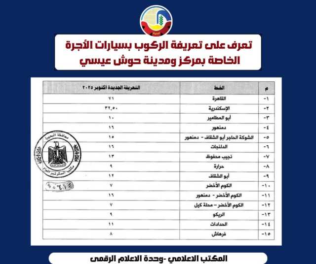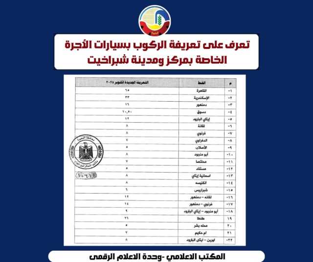 بعد إرتفاع سعر البنزين .. اعتمدت الدكتورة جاكلين عازر محافظ البحيرة، التعريفة الجديدة لركوب سيارات الأجرة والسرفيس والنقل العام والتاكسي والتوك توك.