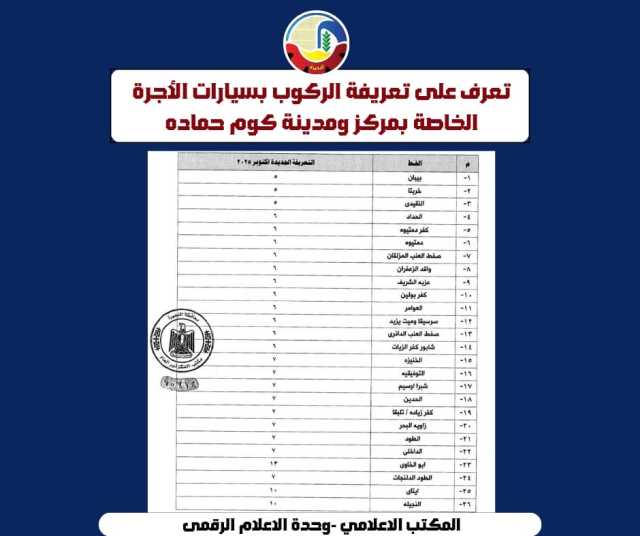 اعتمد الدكتور أيمن الشهابى محافظ دمياط، تعديل تعريفة الركوب لسيارات الأجرة بنطاق المحافظة، وفقًا لما هو موضح بالجداول المرفقة ، كما إعتمد تعديل تعريفة الركوب لسيارات التاكسي وذلك بفتح العداد الكيلو الأول من ١١.٥ جنيه إلى ١٣ جنيه والكيلو الذى يليه من ٣.٤٥ جنيه إلى ٣.٧٥ جنيه ، وذلك عقب قرار لجنة التسعير التلقائي بتحريك أسعار المواد البترولية اعتبارًا من اليوم.