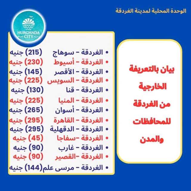 اعتمد اللواء عمرو حنفى محافظ البحر الأحمر التعريفة الجديدة للنقل الداخلي بين المدن بين المحافظات عقب زيادة اسعار المحروقات صباح اليوم وكلف الوحدات المحلية بتعليق الاسعار بالمواقف وعلى السيارات ومتابعة التزام السائقين بالتعريفة المقررة وخطوط السير