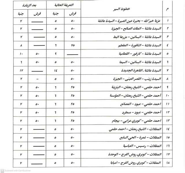 قامت محافظة القاهرة بتعديل تعريفة ركوب سيارات السرفيس، والنقل العام، والنقل الجماعى، والأقاليم، والتاكسى الأبيض، وذلك فى ضوء صدور قرار تعديل سعر البنزين والسولار.