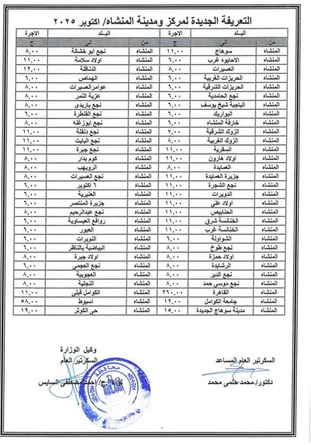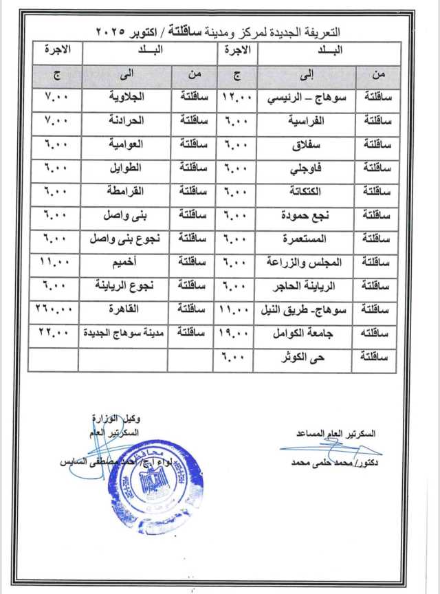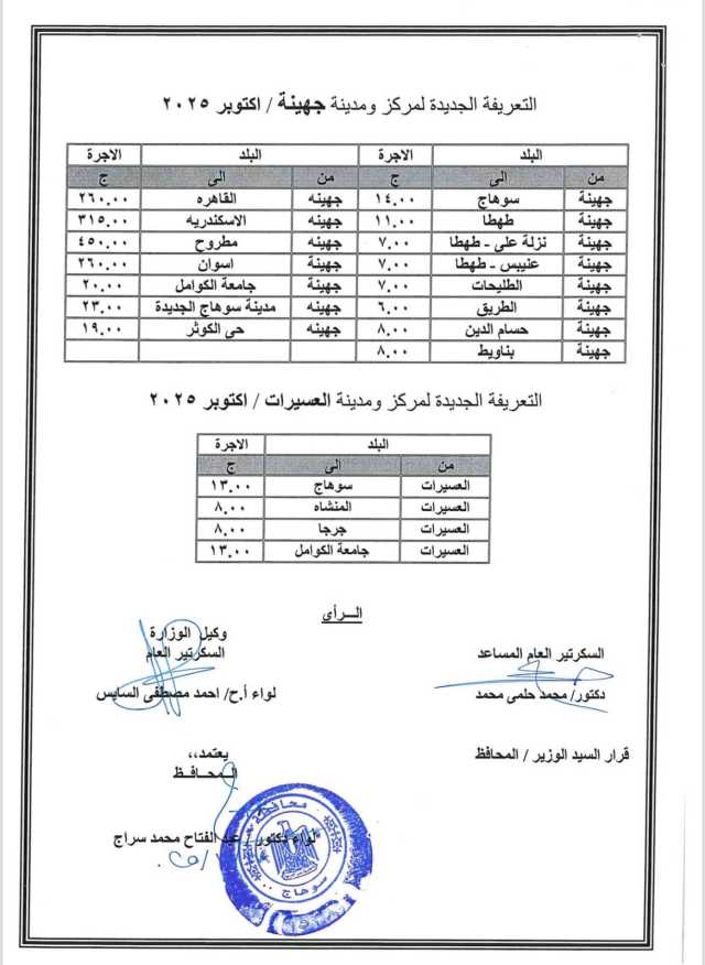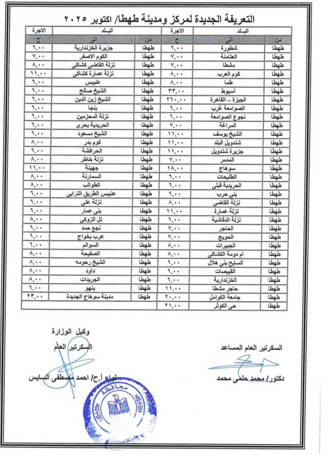 أصدر اللواء الدكتور عبد الفتاح سراج، محافظ سوهاج، القرار رقم ٧٢٦ لسنة ٢٠٢٥، بشأن تعديل تعريفة الركوب لسيارات الأجرة العاملة بنطاق المحافظة.