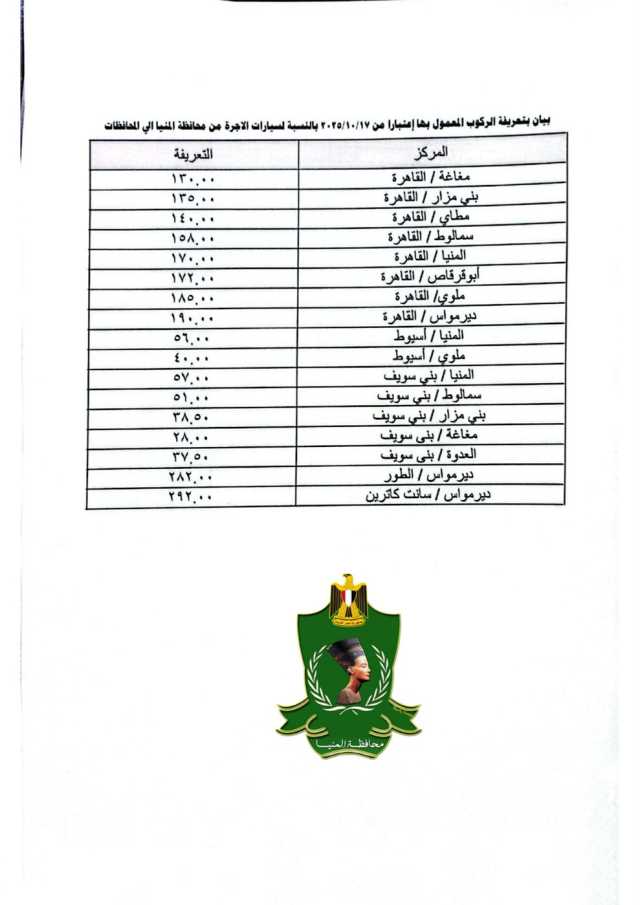اعتمد اللواء عماد كدواني، محافظ المنيا، تعريفة الركوب الجديدة للمواصلات العامة، بدءاً من اليوم الجمعة الموافق 17 أكتوبر الجاري، وذلك عقب قرار تحريك أسعار المواد البترولية، حيث شملت التعريفة الجديدة خطوط السير الداخلية بين أحياء المدينة، وخطوط الربط بين مراكز المحافظة التسعة، وكذلك الخطوط الإقليمية التي تربط المنيا بالمحافظات المجاورة، حيث جاءت تعريفة الركوب الجديدة على نحو :