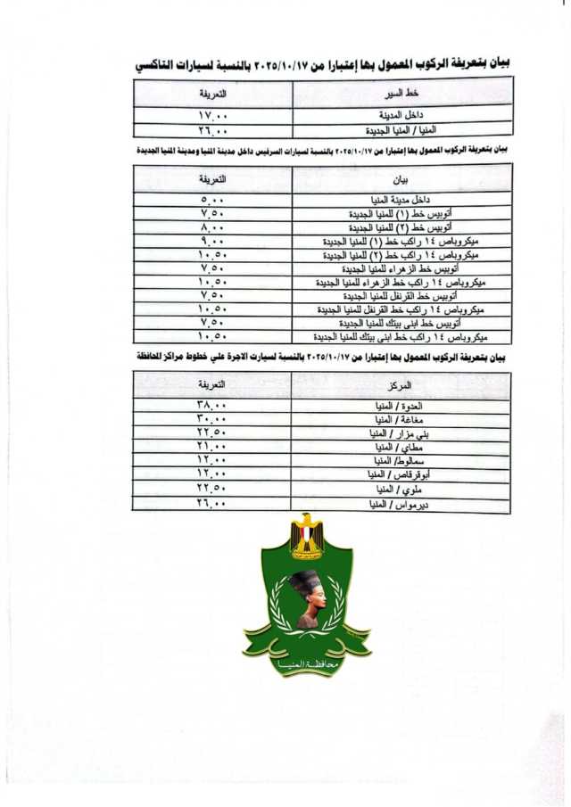 كلمات دلالية: التعريفة الجديدة أخبار محافظة المنيا