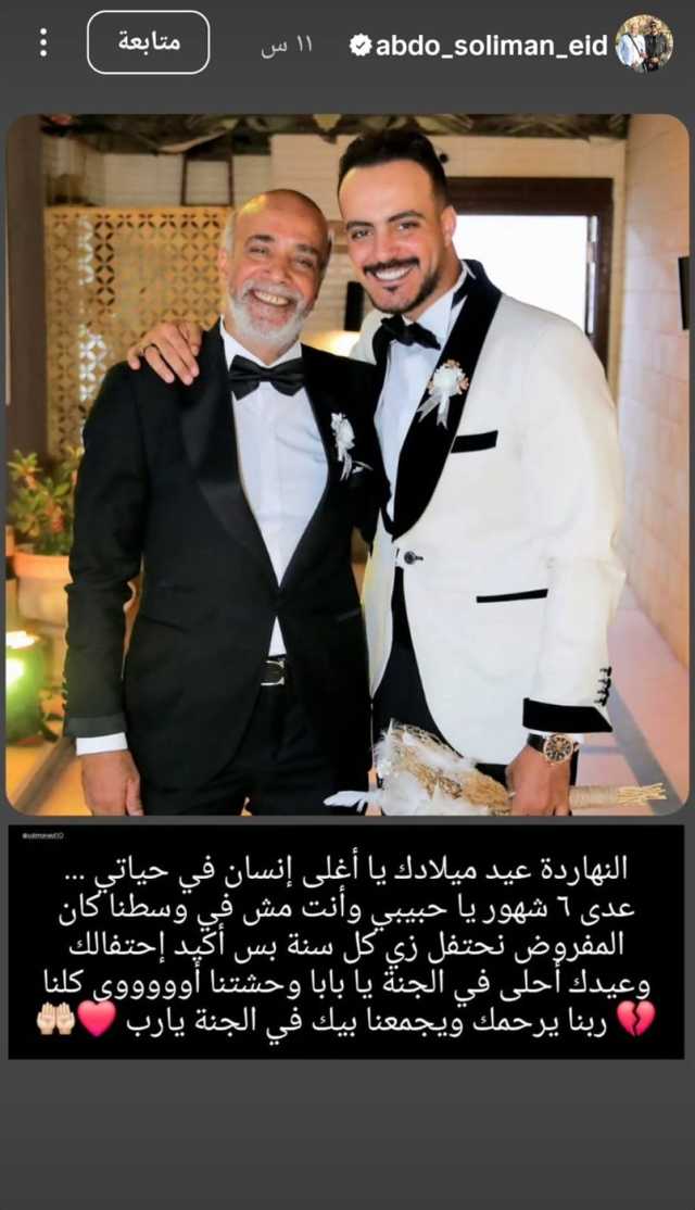 وبهذه المناسبة، حرص نجله على إحياء ذكراه بطريقته الخاصة، حيث نشر عبر خاصية “الستوري” على حسابه الرسمي بموقع إنستجرام صورة جمعته بوالده، وأرفقها بكلمات مؤثرة عبّر من خلالها عن اشتياقه الكبير له، مؤكدًا أن ذكراه ستظل خالدة في القلب والوجدان.