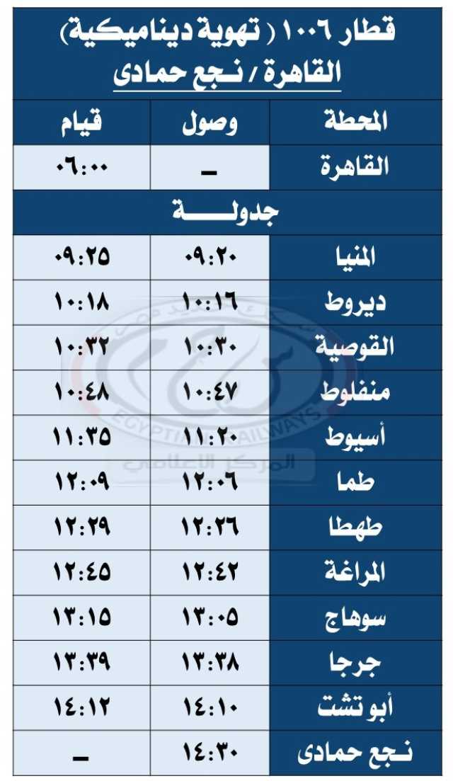 قطار رقم 1007 نجع حمادي القاهرة (تهوية ديناميكية) موعد قيامه الساعة 18.10مسا ويصل 2.30 صباحا.