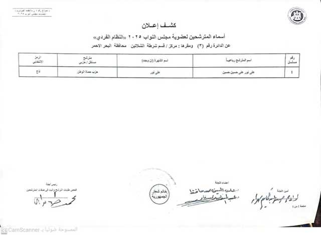 هذا وتعلن اللجنة المشرفة على أنتخابات النواب بالبحر الأحمر صباح غدا الخميس الكشف المبدئي الخاص بالمرشحين المحتملين الذين تقدموا بأوراقهم .