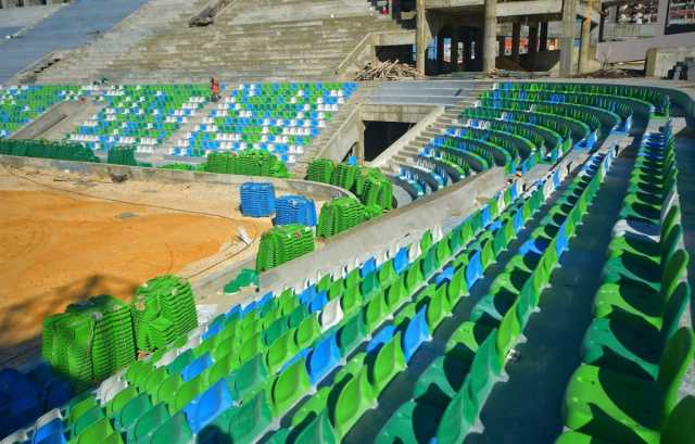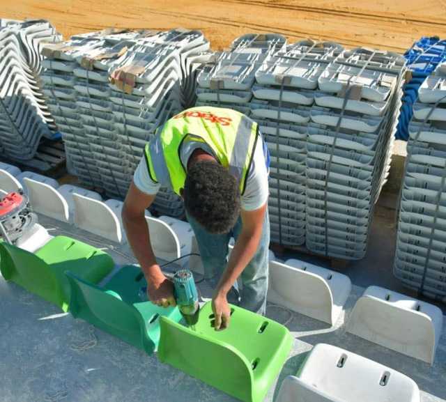 كما تم البدء في تركيب كراسي مدرجات الدرجة الأولى والثانية والثالثة، إلى جانب استمرار أعمال تركيب المظلة المعدنية أعلى المقصورة الرئيسية، التي تُنفذ وفق أحدث التصميمات الهندسية لتوفير أعلى معايير الأمان والراحة للجماهير.