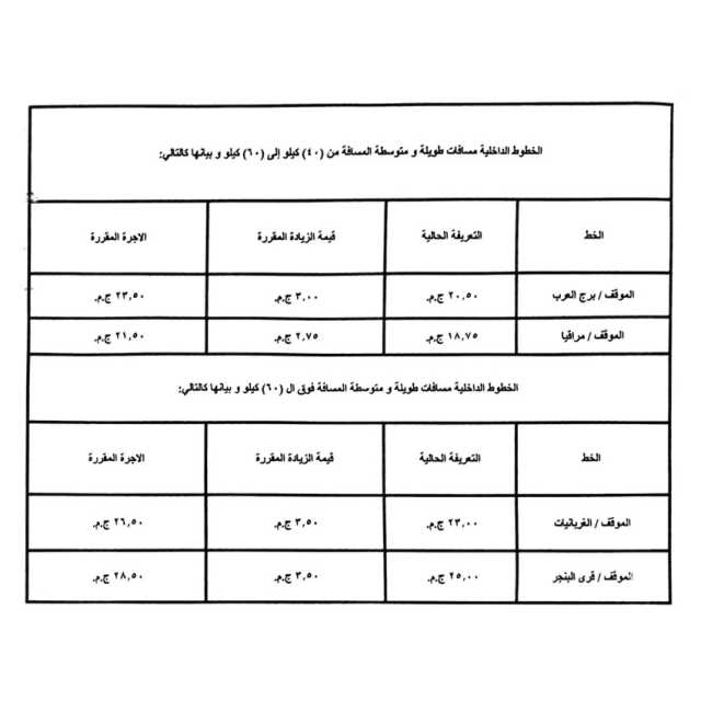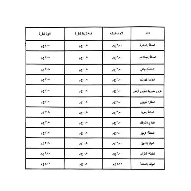 وشدد المحافظ على ضرورة الإعلان الواضح عن التعريفة الجديدة في جميع المواقف والمحطات، مع إلزام السائقين بوضع ملصقات رسمية تتضمن خط السير والأجرة المقررة لكل وسيلة نقل، منعًا لأي تلاعب أو تقسيم غير قانوني لخطوط السير.