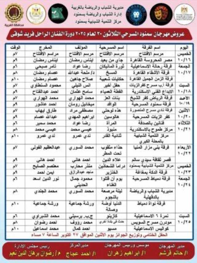 انطلاق فعاليات مهرجان سمنود المسرحي في دورته الثلاثين.. دورة الفنان الراحل فريد شوقي