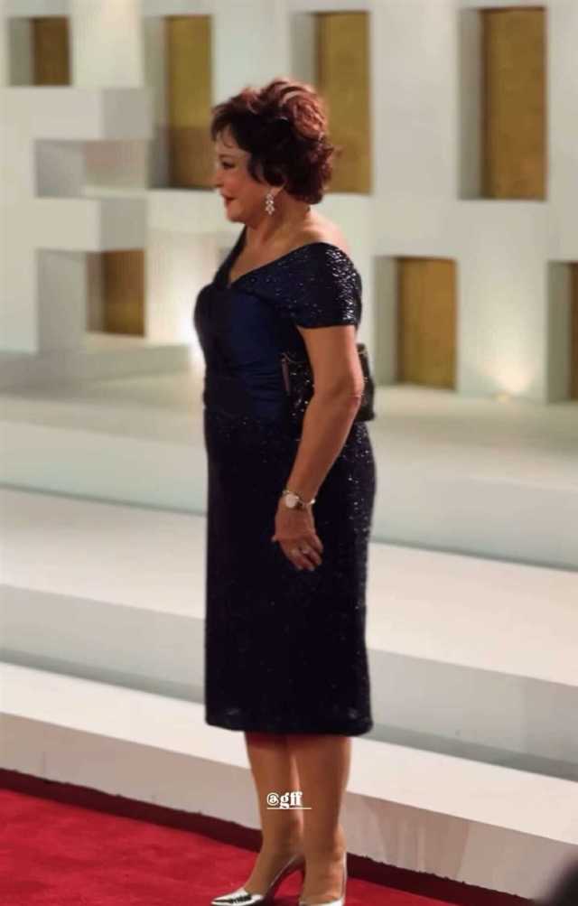 وبدت لبلبة بإطلالة محتشمة جذابة، مواكبة لموضة فساتين سهرة 2025، مرتديه فستان قصير مجسم مصمم من قماش الساتان الناعم بلون الكحلي لتستعرض قوامها الممشوق ووزنها المثالي.
