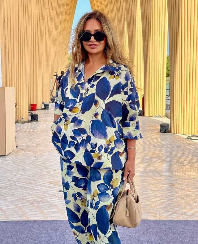 وظهرت ليلى علوي ببيجاما مطبوعة بأوراق الشجر باللون الأزرق ، ضمت قميص بأكمام وبنطلون، حملت حقيبة جلد باللون البيج.