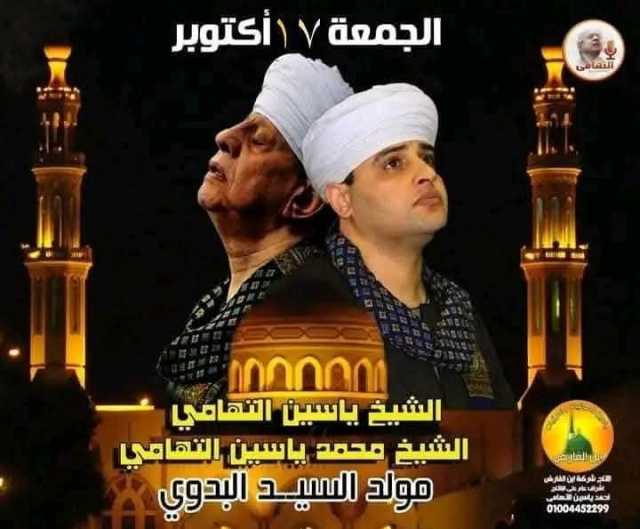 حلقات المديح والإنشاد الديني وحلقات الذكر تشعل لهيب زوار السيد البدوي مساء اليوم الذين حرصوا علي المشاركة في حضور حفل الشيخ ياسين التهامي كبير المنشدين وابنه الشيخ محمد ياسين التهامي لإحياء ذكرى مولد شيخ العرب بمشاركة الملايين من الزوار ومشايخ الطرق الصوفية بمنطقة الساحة الأحمدية بمحيط مسجد السيد البدوى بطنطا.