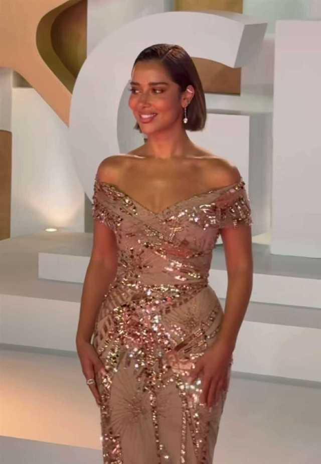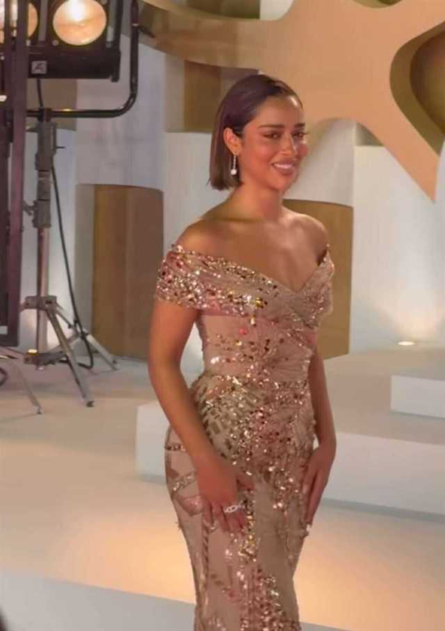 مهرجان الجونة السينمائي 2025.. بلقيس فتحي تعتمد موضة الأوف شولدر بالذهبي اللامع