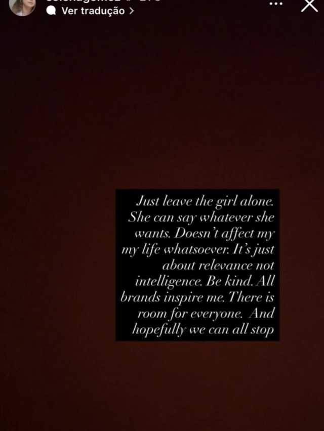 وكتبت سيلينا جوميز، عبر خاصية الاستوري في حسابها الرسمي علي موقع الصور والفيديوهات “إنستجرام”: "دعوا الفتاة وشأنها.