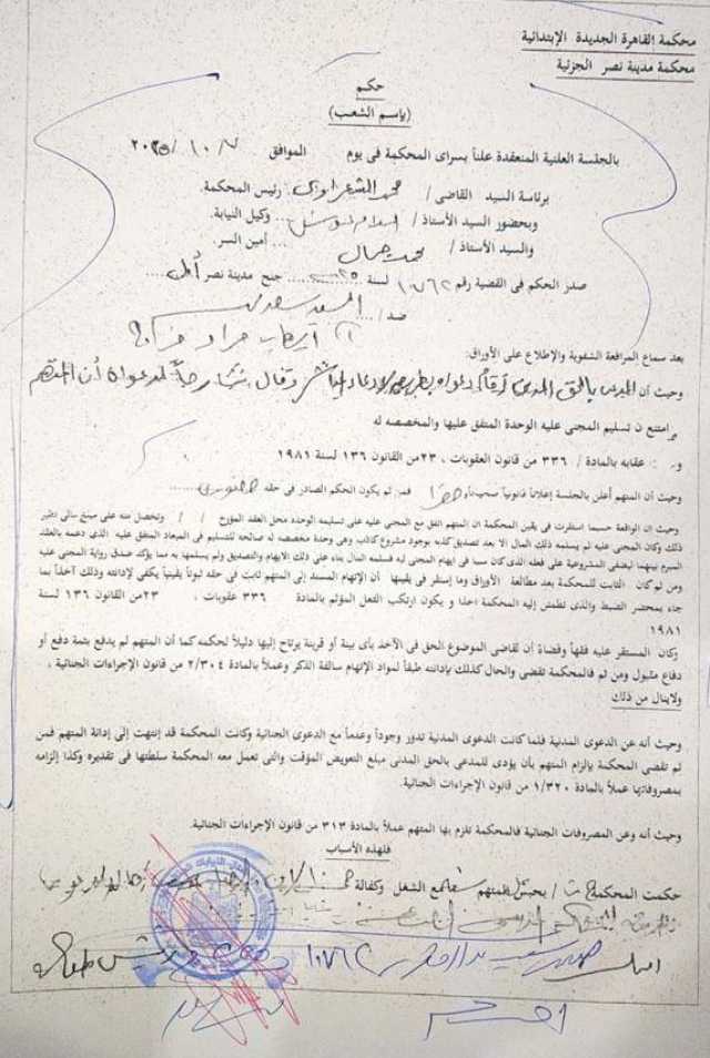 كانت محكمة مدينة نصر الجزئية برئاسة المستشار ( محمد مبارك ) قد أصدرت حكم بجلسة ٢٤ / ٩ / ٢٠٢٥ من..ضد رجلي الأعمال ( السيد سعد محمد سعد ، وشريكه إيهاب مراد فراج ) مالكي شركة كايرو كونسلت للتنمية العقارية ( عن مشروعها الوحيد - سرايات القطامية / مكاني ) ، في القضية رقم ١٠٧٦٥ لسنة ٢٠٢٥ جنح أول م . نصر بالحبس لمدة سنتين مع الشغل وكفالة 200 ألف جنيه مع تعويض مؤقت ٤٠٠٠٠جم في جنحة التراخي في تسليم وحدة سكنية.