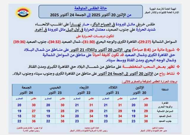 أعلنت الهيئة العامة لـ الأرصاد الجوية عن توقعات غير اعتيادية بشأن حالة الطقس خلال الأيام المقبلة، محذّرة من موجة صيفية مفاجئة تضرب معظم أنحاء الجمهورية، في ظل ارتفاع ملحوظ بدرجات الحرارة عن المعدلات الطبيعية لهذا الوقت من العام، لتسود أجواء أقرب إلى فصل الصيف رغم اقتراب نهاية شهر أكتوبر.