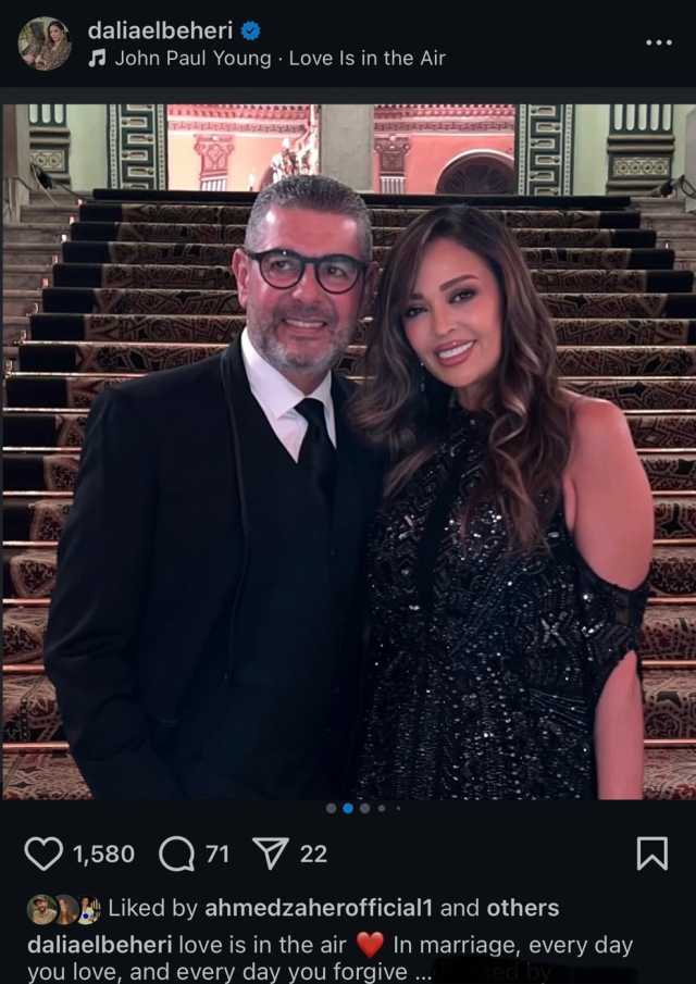 في أجواء رومانسية، شاركت الفنانة داليا البحيري جمهورها صورة جديدة جمعتها بزوجها عبر حسابها الشخصي على موقع انستجرام، وعلقت عليها قائلة: “الحب يحيط بنا، في الزواج نحب كل يوم، ونغفر كل يوم.”