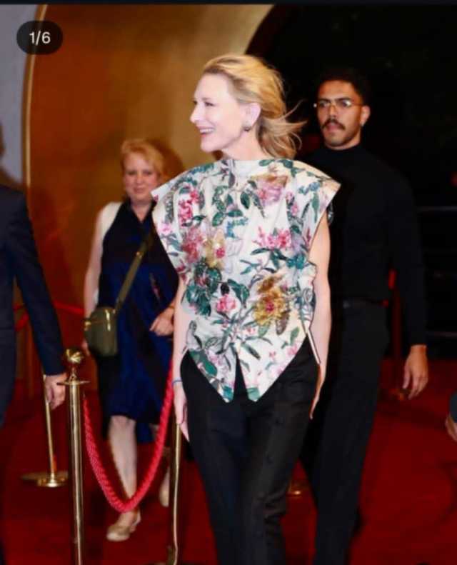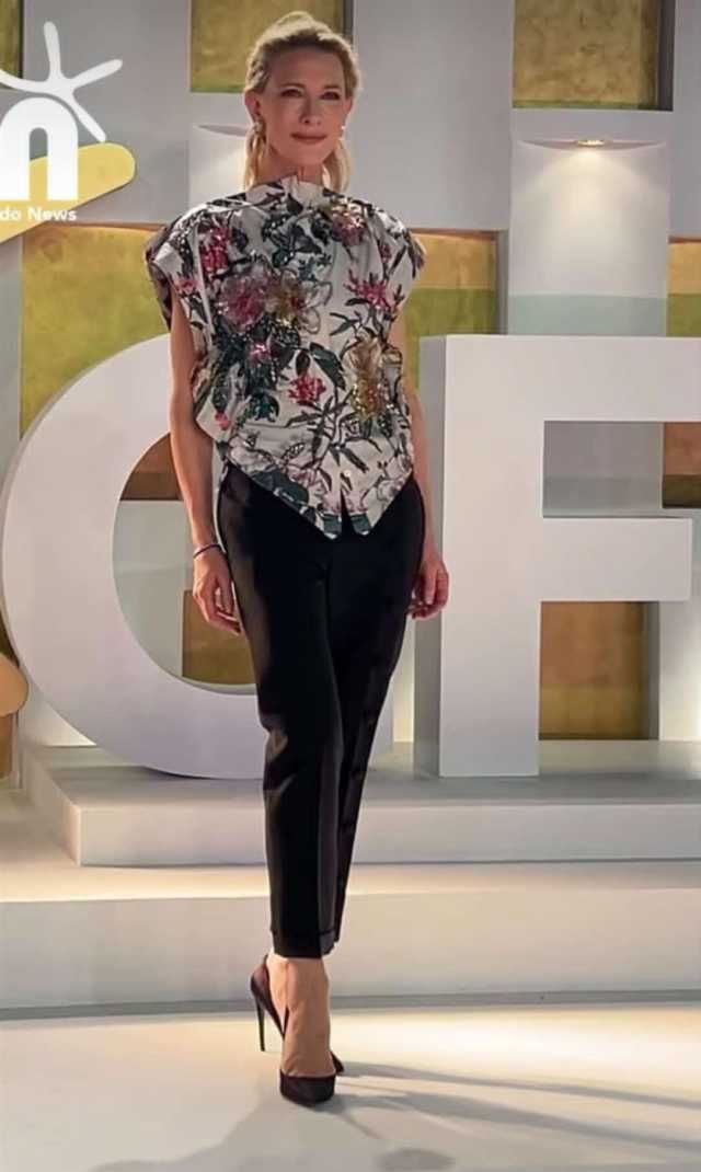 اختارت بلانشيت بلوزة حريرية بتصميم واسع ومزيّنة بطبعات ورود كبيرة بألوان هادئة مع لمسات لامعة، أضفت عليها طابعًا فنيًا راقيًا، ونسقتها مع بنطال أسود أنيق بقصة مستقيمة أبرز رشاقتها وأضفى توازنًا مثاليًا على الإطلالة، وأكملت اللوك بحذاء كعب كلاسيكي أسود وتسريحة شعر طبسيطة، مع مكياج ناعم.