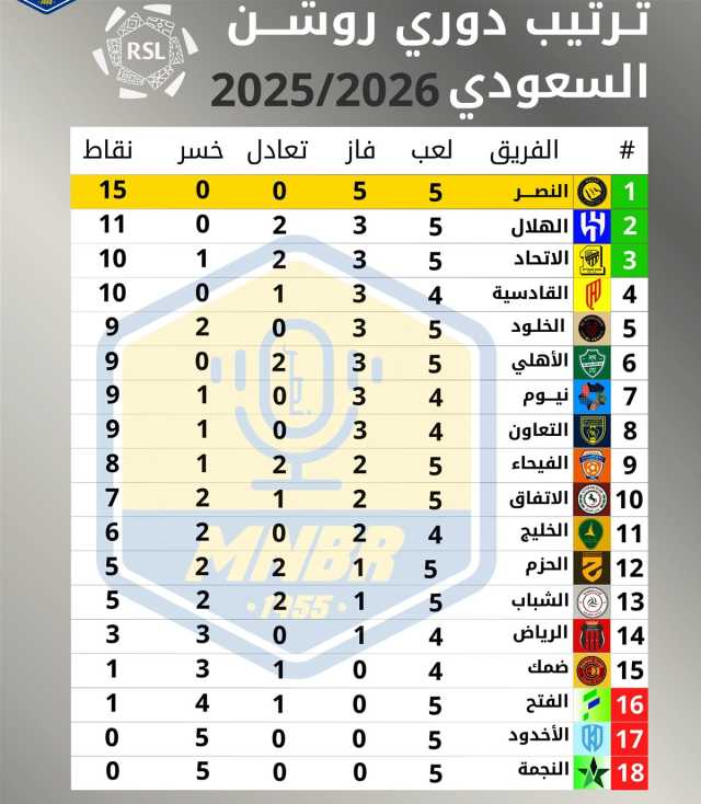 ونجح النصر في الحفاظ على صدارته لجدول ترتيب دوري روشن بعد تحقيق العلامة الكاملة برصيد 15 نقطة من 5 مباريات، بفارق 4 نقاط عن الهلال الوصيف بـ11 نقطة.