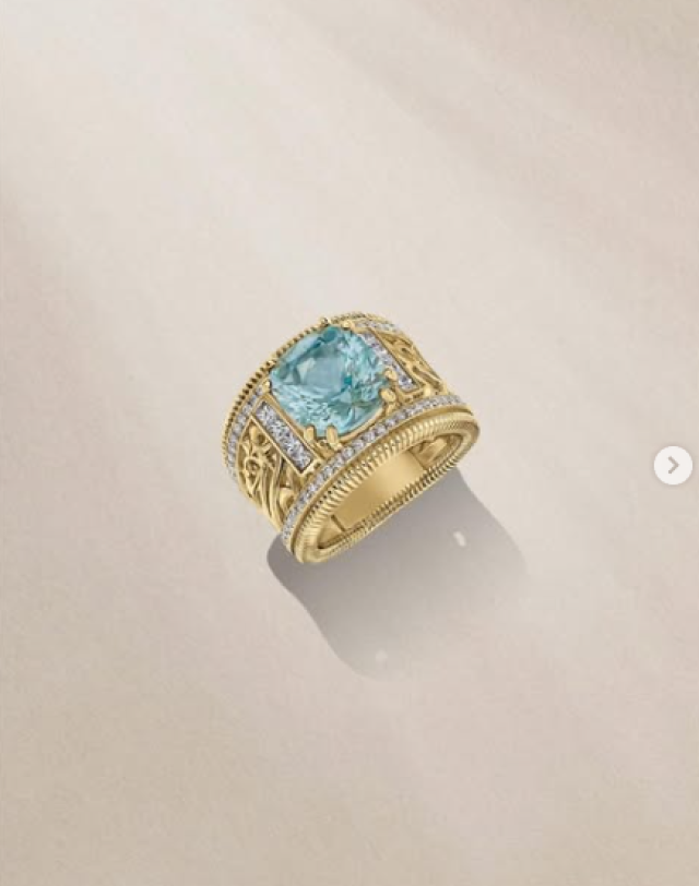كما ارتدت خاتمًا مميزًا من طراز "Art Deco Calligraphy"، مستوحى من فن الخط العربي، مرصعًا بحجر أكوامارين يزن نحو 4.4 قيراط، ليعكس بريقًا أنثويًا ممزوجًا بلمسة من التراث المصري الأصيل، إلى جانب سوار ذهبي فاخر أضاف لمسة متكاملة من الفخامة.