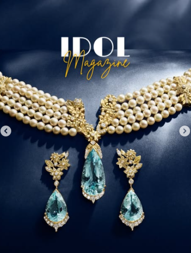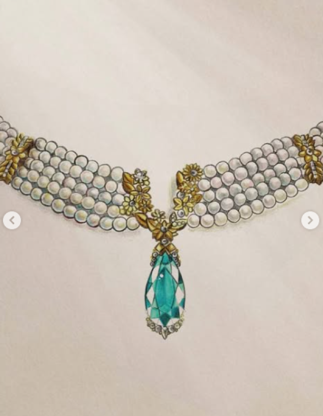 وتكوّنت المجموعة من عقد شوكر فاخر من مجموعة “حديقة النور”، مرصّع باللؤلؤ والأكوامارين النادر، المعروف بلونه الأزرق الفاتح الذي يرمز للصفاء والهدوء، التصميم جاء متوازنًا بين الكلاسيكية والحداثة، مما منح رقبة شيرين لمسة ملكية مفعمة بالأنوثة.