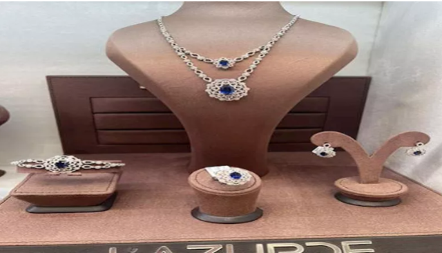 اختارت درة مجموعة فاخرة من مجوهرات لازوردي، صُممت من الذهب الأبيض ومرصّعة بالكامل بحبات الألماس اللامعة التي تتخللها أحجار الياقوت الأزرق الداكن، في مزيج أنيق يعكس الذوق الرفيع والأنوثة الكلاسيكية.