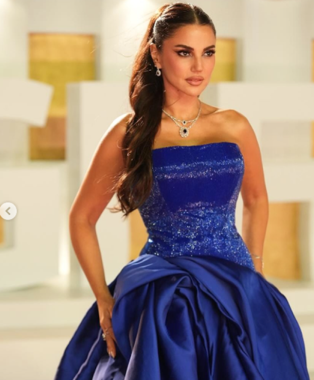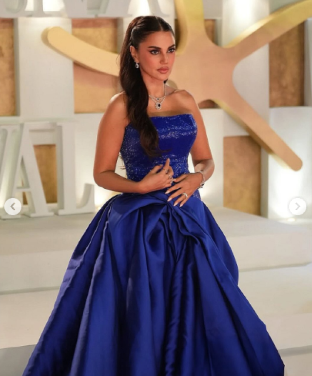 تألقت بقلادة مبهرة مزدوجة الطبقات، تميزت بتصميمها المتداخل الذي أبرز جمال أحجار الياقوت وكثّف من تأثير الفخامة، لتتناغم بسحر مع لون فستانها الأزرق النيلي الذي منحها حضورًا ملكيًا متفرّدًا على السجادة الحمراء.